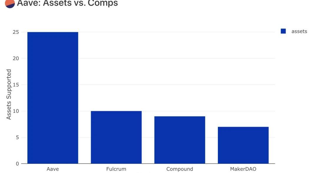 1.长尾资产从一开始,Aave就采取了一种积极的市场上市方式:目前,它支持25种资产,而Compound有9种,MakerDAO有6种。该项目利用了人们对长尾加密资产再次燃起的兴趣,成为了唯一一个提供那些越来越受欢迎的资产的场所。值得注意的是,Aave也是第一个将USDT上市的DeFi货币市场,并将其作为抵押品类型启用,可以从iEarn、mStable和InstaDapp等第三方聚合器集成中获益。