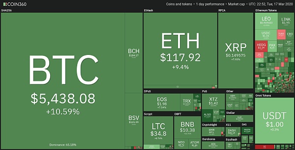 比特币市场周二继续从上周一度跌至3700美元的灾难性暴跌中复苏,该数字资产今日一度突破5500美元,随后回落至5400美元以下。加密市场走势的转暖似乎是从今天的白宫新闻发布会上获取的士气,美国财长姆努钦证实了有关特朗普政府将实施价值达1万亿美元的冠状病应对方案的报道。