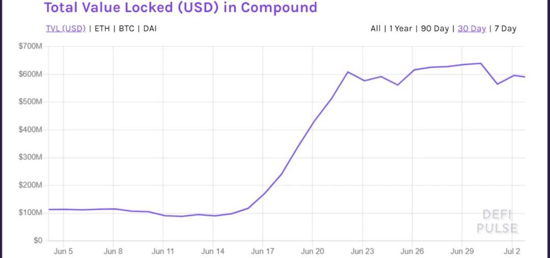 Compound成为了最受欢迎的DeFi借贷协议,并在总锁定价值上超过了MakerDAO,总锁定价值超过了1亿美元。到6月16日协议的治理和奖励代币COMP推出时,Compound的TVL急剧上升。6月23日,该代币价格在CoinbasePro上从90美元迅速爆涨到400多美元,不过目前已经回调到180美元左右。Compound的流通供应量约占其总供应量的25%,即使如此,也足以在市值上也超过MakerDAO。与2017年的差异