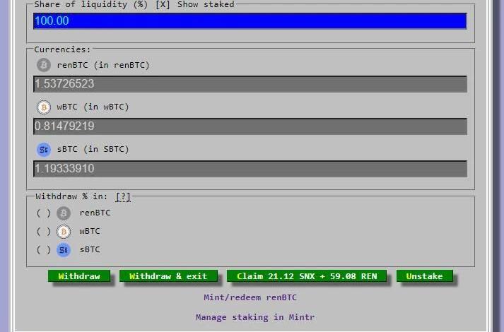 以下就是手把手教你如何通过为Curve资金池注入BTC锚定币流动性撸到4种代币奖励:1.如何获得renBTC有sBTC、renBTC或wBTC的用户,可以跳过此步骤。如果需要换取以上这些BTC锚定币,那就需要以BTC进行兑换。以下介绍如何将BTC换成以太坊上的封装代币renBTC。最简单的方法是使用RenBridge,并需要使用Metamask和准备少量的以太坊来支付gas费。此外,还可使用路印协议Loopring兑换renBTC。路印协议刚刚在用户界面中新增支持Ren协议的RenBridge,允许用户使用比特币铸造renBTC,以zkRollup方式使用。目前renBTC已支持存入Loopring交易所和LoopringPay,将于大约1周后将上线renBTC/USDT交易对。RenBridge费用为0.10%+比特币交易费,因此1BTC只能换取0.99865renBTC。选择你想要铸造的数量,然后进行下列操作。