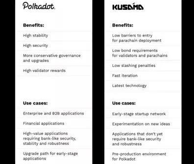 和ETC的平均燃料费和4月24日它们各自的市场价格来做分析;;;,我们知道Polkadot平行线程的成本大约是50DOT。从以上估算可以看出,两年期的Kusama平行链的质押代币价值和实际借贷费用可能分别低至8100美元和151美元。这明显低于Polkadot的67.5万美元的质押代币价值和6.75万美元的借贷费用。对于那些资金不足或没有资金支持的团队,在他们能筹集到更多资金升级到Polkadot之前,Kusama可作为他们维护生产部署以及构建产品原型和核心社区的合适场所。?产品属性Polkadot的定位是一个利害关系相对较高的环境,用于有效地管理稀缺资源,并完全专注于提供高度的安全性和稳健性。相比之下,Kusama则没有Polkadot那么稳健和安全。说它没有那么稳健,是因为新技术在部署到Polkadot之前,会持续地部署到Kusama上进行测试。从理论上讲,这意味着Kusama的故障可能会更频繁,但同时Kusama的无价值测试网络Westend的使用一定程度上也能规避这些问题。此外,Kusama的治理在设计上来说演进得更快”,这意味着这个网络可以比Polkadot发展得更快。这两个设计特点使得Kusama成为了那些想要与Polkadot部署的技术绝对前沿保持同步的团队的合适场所。说它的安全性较低,纯粹只是因为KSM的价格远低于DOT,从而更容易通过治理来接管Kusama。取决于你想要构建的是什么——也许是一个银行间的金融服务平台或者是一个带收集性质的赛车游戏——下表也许能为你的平台选择提供一些指导。产品属性的划分表明,Kusama不太可能蚕食Polkadot的典型用户。?社区组成三种类型的Kusama社区正在形成。根据Gavin?Wood在这个Q&A中所言,“Society”,“Tipping”,“Recovery”,“Long”的部署,以及对Kusama财政库的利用都将提高社区的兴趣和对各种实验的参与度。其次,最初在Kusama上进行架构的团队,当然,他们的社团最初也将会围绕Kusama而产生。Acala、Moonbeam和Chainlink是第一批宣布在Kusama上部署的团队。即使在他们升级到Polkadot之后,他们的创世社区中的一些人也可能还会留在Kusama上。最后,为了测试目的而在Kusama上镜像投射的Polkadot平行链也将通过激励利益相关者在Kusama上积极尝试新特性而拥有一个平行社区。上述情况表明了对Kusama平行链的真正需求,这使我们相信,随着时间的推移,Kusama将积累巨大的价值。Kusama-Polkadot跷跷板
