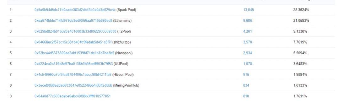 以太坊全网HashRate图2020-7-7日(数据来源:Etherscan)ETH产品的算力市场中,主要份额由Sparkpool,Ethermine,F2Pool,SpriderPool,NanoPool等矿池与小型旷工共同占有,其中SparkPool与Ethermine占据了约50.5%的算力市场份额。近1个月以来的矿工区块市场份额分布图如下所示: