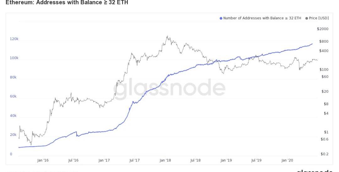 周一Bitfly官方发推称,ETH2.0测试网Altonav0.12也正式启动,Prysm、Teku、Lighthouse和Nimbus四大客户端已开始运行测试网。此外,投资者对于ETH2.0也报以期望,越来越多的人开始囤积ETH试图参与其中。Glassnode数据显示,截至6月30日,有多达116474个以太坊地址拥有至少32个ETH,比启动第0阶段所需的验证者数量高出大约七倍。