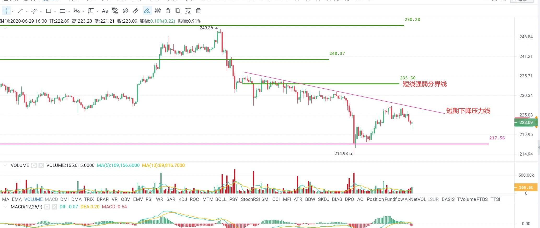各级别性质:日线-盘整,4小时-盘整,1小时-下跌截图来自OKEXETH/USDT永续合约1小时图:目前的客观走势及应对策略:从目前的走势看也是比较符合昨天晚评预期的,币价最高反弹至228附近后开始受阻回落。目前短期下跌格局得到延续,对于这段下跌趋势来讲233依旧是最重要的位置,具有短期强弱分界线的意义,未明确上破该价位前,短期操作不改主空思路。不过同样由于中线关键支撑217一线尚未跌破,而且当前价格距离较近,所以对于短期的下跌空间也不要盲目期望过高。倘若217关键支撑出现明确跌破现象,那么中线走势转向空头概率则会大大增加,要提前做好应对计划,任尔东南西北风,来者不拒。图中画了一条下降压力线,如果手里有空单持仓,可以考虑将止损位设置于该线上方一些。主观预期:昨日预期目前初步兑现。认为接下来短期有效跌破217概率不大,或将围绕217-226区间展开盘整格局运行。本段不作为交易策略参考。阻力与支撑阻力:226--233--240支撑:217--205--197EOS/USDT永续合约