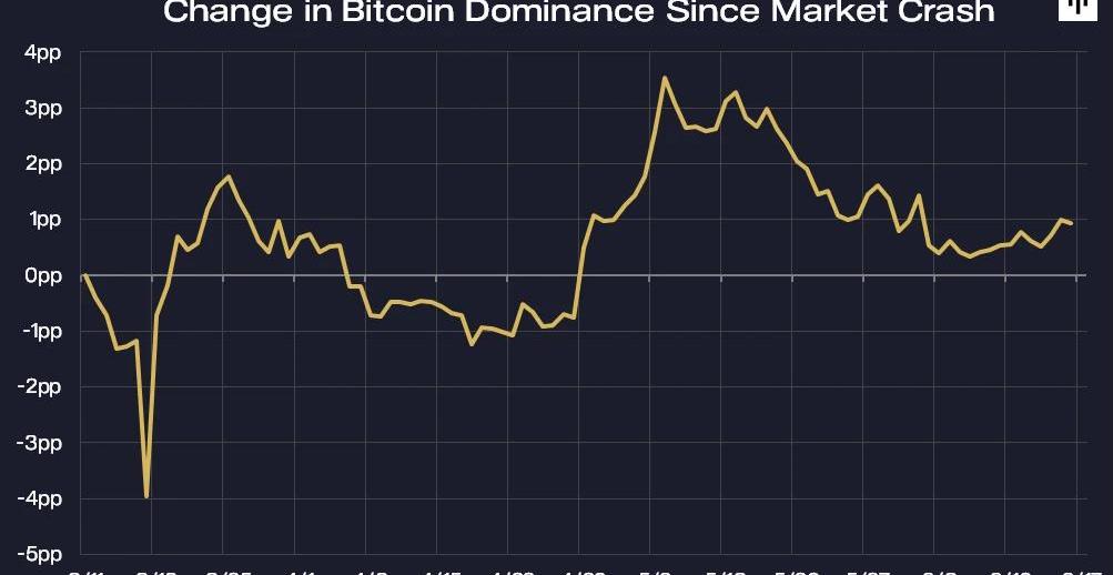 "我们相信比特币可能会在一段时间内超越其他代币......历史上主导权的增加平均持续了约4个月,平均收益为7.8%。我们相信这种情况很可能再次发生。""比特币主导权"--比特币在整个加密货币市场的份额--在3月中旬为64.60%。它在5月19日达到顶峰,为68.73%,现在回到了64.60%。我们预计它将下降,因为其他加密货币开始有了出色的表现--就如之前所述的。