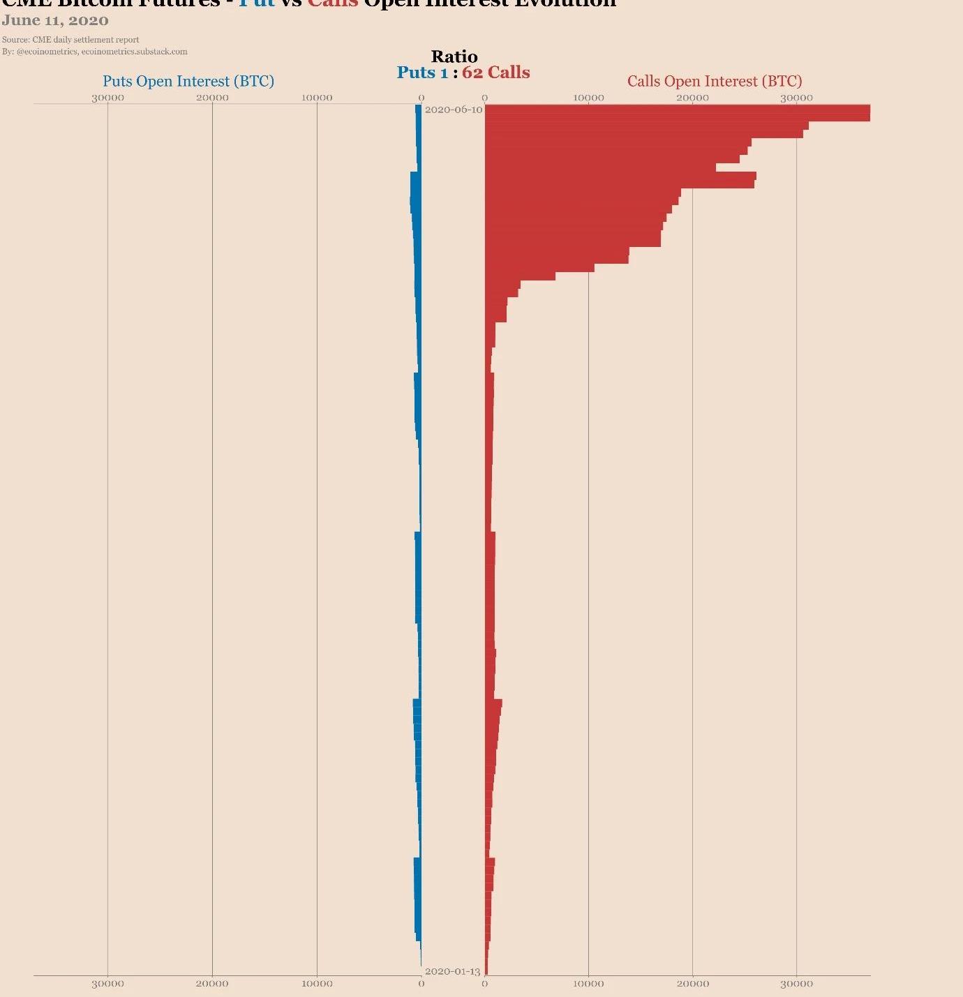资料来源:Skew下面的CME看跌与看涨未平仓权益演变图更全面地展示了大趋势。它显示出今年年初以来,看涨期权显著增长,并且越来越偏向于看涨一方。根据6月11日CME披露的数据,Ecoinometrics报告的看跌与看涨比率为1:62。但此后,市场在6月11日晚间突然出现了800美元的价格下跌,期权市场对此反应迅速。我们根据CME最新披露的信息重新评估了该数字。截至6月11日收盘,未平仓的看跌/看涨比率已反弹至1:45,但仍处于不可思议的低位区间。