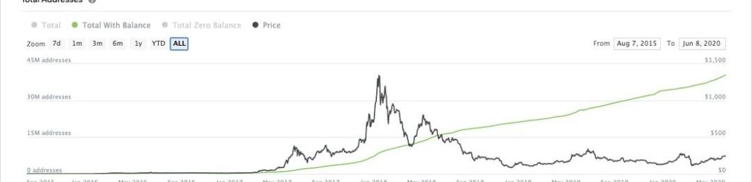 通过分析持有ETH余额的地址总数,可以观察到另一个ETH购进的迹象。如前所述,自3月以来,持有ETH的地址总数一直在增加。实际上自2017年以来,它一直处于持续上升的趋势,如下图所示: