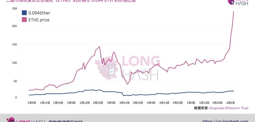 随着以太坊的需求越来越高,以及整个加密货币市场的逐渐回暖,ETHE的价格在最近几周飙升。该信托的需求也相当高,根据Tradingview的数据,截至6月4日,ETHE的价格自2019年初以来上涨了600%。而同期以太坊才涨了约50%。在6月4日交易结束时,场外价格显示该信托每股价格达到史上最高239.5美元。而与此同时,分析师CeterisParibus观察到,Coinbase上的以太坊也就241.48美元。每股ETHE对应约0.094ETH,也就是说,场外ETHE的买家实际支付的价格是该资产净值的近1000%。具体溢价变动可以参考下图,其与以太坊之间的差距达到全年来的最高点。