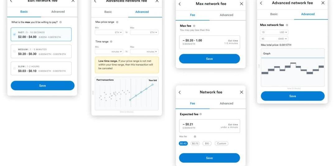 EscalatorAlgorithm提案本身就很有意思,我强烈推荐阅读此提案的“userstrategy(用户策略)”部分,以便对三种不同的交易处理模型有一个高层次的比较。如果你对此感兴趣,这篇介绍EscalatorAlgorithm的论文也很值得深入研究,但我有些跑题了...在一次EIP-1559实施者的电话会议上,DanFinlay给出了一些模型,展示了钱包中各种参数向用户呈现的方式,强调了这些如何可以根据所需的用户干预级别来隐藏或者显示这些参数。见下图: