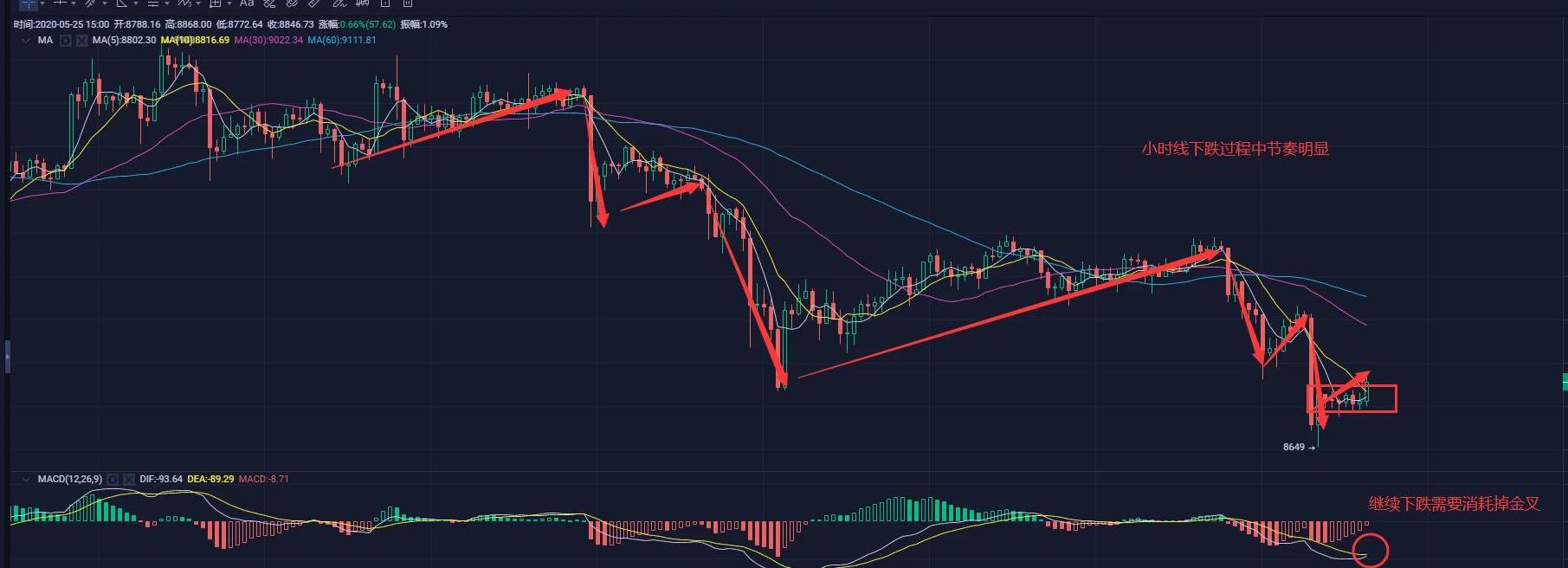 普通币圈投资者一直以来的逻辑是:比特币是稀缺的,总量只有2100万枚,加上POW挖矿减半的发行机制,比特币的供应量是通缩的。但其需求却随着区块链和数字货币市场的发展、宣传和推广,与日俱增,因此比特币的价格只会越来越高,现在不买,以后拍断大腿。从商品供求关系看,这个逻辑没有一点儿问题。但如果叠加了金融属性的玩法,情况则有所变化。加密评级机构韦氏评级发推称:“比特币的供应量要高于2100万枚。交易所可对任何加密资产的现有供应进行杠杆化,就像银行可对法定货币的供应进行杠杆化一样。”也就是说,对于机构,即使在之前没有屯够足量的BTC,但只要是金融市场,巨头们便有很多方法去获得BTC,而不是靠一味地买入。比如通过合约等衍生产品,不需要实物BTC,通过资金来操纵币价涨跌,收割市场多空头的过程中,便获得了足够多的比特币筹码。之前的比特币供应量是被挖矿产业链控制,因为他们掌控了新增比特币的供应,对比特币拥有天然的定价权。但现在情况在逐步变化,虽然还有几百万枚BTC通过挖矿在流入,但市场上流通了大量的比特币,比特币的定价权在这次减半后,已经由矿工群体转移到了市场本身。而能影响市场的,一个是交易所,另一个是资金实力雄厚的庄家群体。对于他们来说,因为自身实力强大,拥有远大于普通投资者的力量,通过各类金融市场规则和玩法,实现降维打击,便能达到收割普通散户的目的。因此,像以往的逻辑“机构进场,肯定要买BTC,BTC价格铁定要涨”的逻辑,并不一定正确,只是比特币价格上涨的必要而非充分条件。我们在币圈投资交易中,不止是想着如何赚钱进而盲目操作,更重要的是要认识到金融市场的本质,摸清这个市场的游戏规则和真相。简单说,加密货币市场是信仰游戏,因为信仰,所以相信价值,但其背后是缺乏真实价值支撑的。同时,加密货币市场也是博弈和概率游戏,行情在某一点位的涨跌是随即概率、无法预测,庄家和散户是对关系,资金的目的是逐利,注定了少部分赚钱、大部分人亏钱的结果。本就处于不利地位的散户投资者们,唯有了解市场规则,敬畏市场,提升自己的认知和学习能力,才能躲过一些坑,让自己更顽强的生存下来,只有先生存下来,才有赚钱的机会。我们要明白一个底层的逻辑是:认知能力决定了你的财富水平,我们永远赚不到超过自己认知范围之外的钱财。关于认知提升,可以参考我之前的文章《交易的四道门,你在哪道门之内?》,值得反复阅读和思考。回到行情上,比特币前两周9800-10000美金的多空争夺战似乎就在昨日,让人觉得1万美金只是一个开始,庄家不套人不割人,币价肯定飞起。但现在,比特币1万美金却成了较强压力,市场下跌趋势日渐强烈。小时线级别,BTC下跌趋势一目了然:BTC从9800美金跌下来,跌到9350美金,反弹不破9600美金;然后9600跌下来,跌到8800,反弹9300不破;9300跌下来,跌到8600,反弹9000又不破。短时来看,考验9000美金日内压力和8700美金日内支撑,强支撑在8000美金区间。