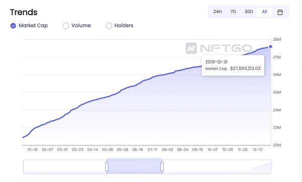 根据nftgo.io的数据显示,2019年1月1日至2019年12月31日,NFT市值从2244万美金增长至2759万美金,年增长率为23%。
