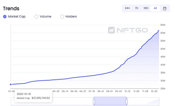 根据nftgo.io的数据显示,2020年1月1日至2021年1月11日,NFT市值从2762万美金增长至6174万美金,年增长率为124%。