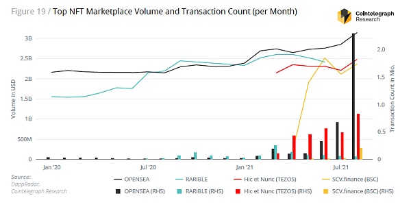 头部 NFT 市场月度交易量(单位:美金)和交易数量(单位:个),数据来源:NonFungible.com, Cointelegraph Research