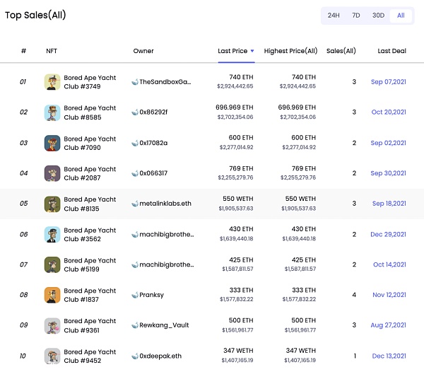 ?Bored Ape Yacht Club(BAYC)前十大成交纪录(2021.4.23--2021.12.30),数据来源:nftgo.io