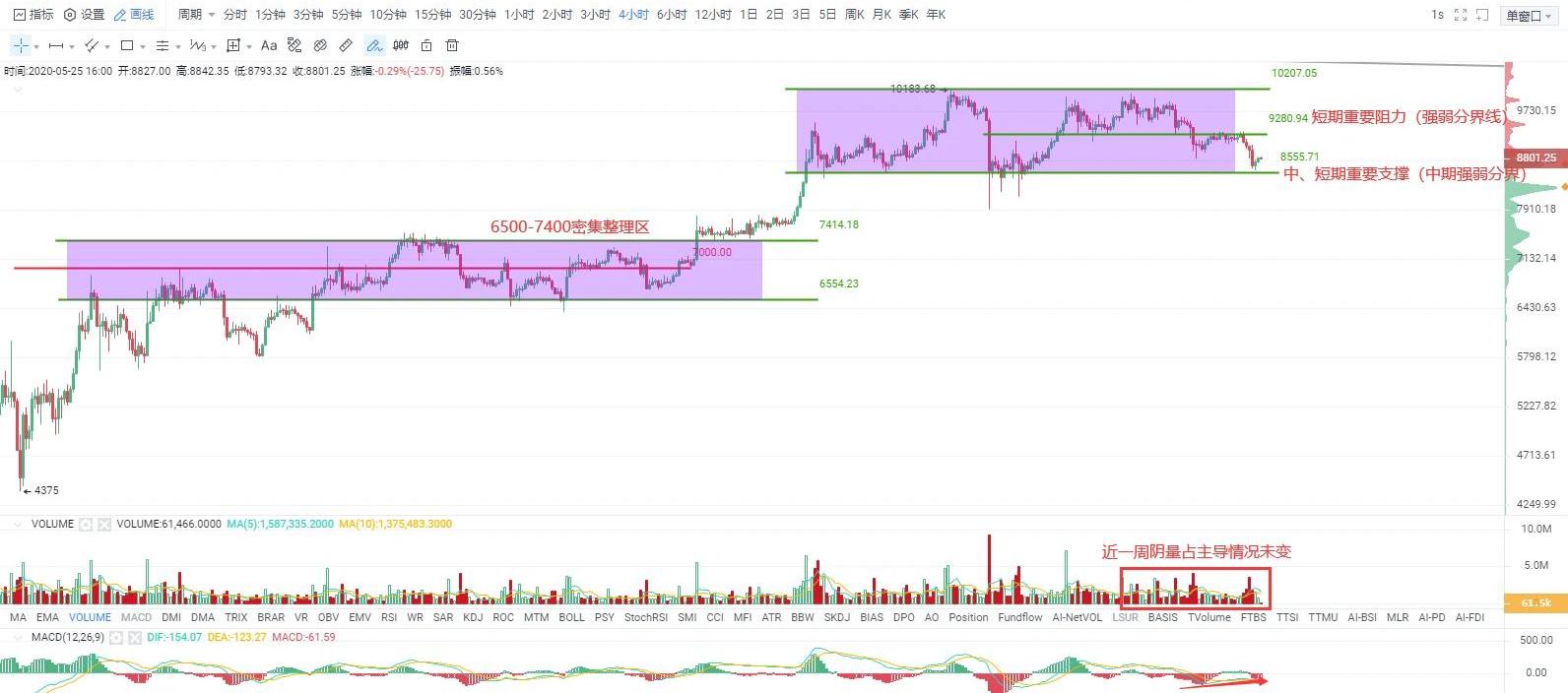 各级别性质:日线-盘整,4小时-盘整,1小时-下跌截图来自OKEX比特币季度合约4小时图:对于行情我从两个角度来说,一个角度是客观的走势状态以及根据客观走势所制定的应对策略,另外一个角度是基于经验的主观预判。实战交易主要依据客观走势下的应对策略,主观预测更多的是对未来的发展的一种前瞻或者娱乐,不可以直接用来作为交易策略,主要目的是提早对潜在的风险和机会有心理准备。目前的客观走势及应对策略:因为周六日我们没有晚评更新,所以周五的晚评会眼光会“大一点”,对未来两三天的走势格局做分析研判。当时建议重点关注的9280阻力和8550支撑通过实际走势看,还是比较符合实际。截图中蓝色的YY部分,和实际走势更加贴合,不过这种全凭经验的主观预测,还是作为娱乐就好,不要作为交易策略。
