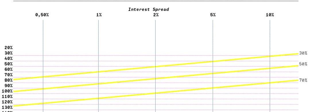 重要结果:我们可以看到,如果坏账率为5%,在某些利差下,不存在任何DAI流通量可以使当前的估值成为赢家。坏账不可能比利差大目前利差为0%,坏账率超过5%最终结果