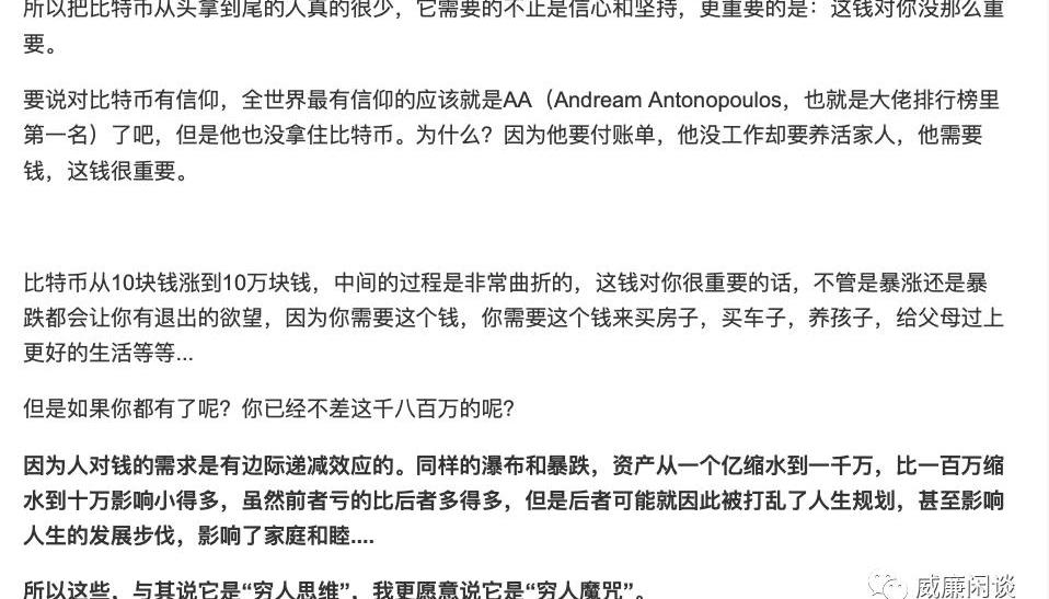 如果你没钱,那么你在做投资的时候很容易被其他东西影响了判断,最后使得你更没钱。同样的,如果你肥胖,那么你就更不想运动更需要吃东西,最后更肥胖,所谓“恶性循环”。所以我给朋友们的建议就是在没有第一桶金之前先认真赚钱,不要把投资当成你最重要的事情来做,而应该把你的工作和自我提升放在第一位,在赚到第一桶金之后,再考虑慢慢把重心从事业往投资上转。那么如何赚第一桶金呢?要么靠拆迁要么靠中彩票,要么就老老实实存钱吧。别信什么穷人才存钱这种话,富人比你更爱存钱。当然了,配置一个比特币肯定也是不可缺少的,幸运的话,他会在几年内帮你更快地达成第一桶金的目标,不幸的话,你肯定也亏不了多少,毕竟也才一个比特币。总之,今天文章就想说三点:1、对穷人来说,研究投资可能是药,越努力懂越多可能亏越快。2、在有第一桶金之前,你所有的时间精力应该是放在赚取第一桶金上。3、持有一个比特币是普通人性价比极高的选择,多了就不一定了。希望大家都能理性看待投资这件事,不要着急致富,否则你只会帮别人致富。最后做个简单的扩展,“人无横财不富”这句话出自古训《增广贤文》,前后文是这样的:人无横财不富,马无野草不肥。人恶人怕天不怕,人善人欺天不欺。善恶到头终有报,只争来早与来迟。黄河尚有澄清日,岂可人无得运时。