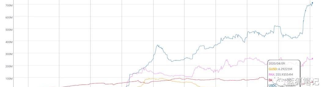 Source:coinmetrics.io,coinmarketcap.com这种增长的很大部分归因于2018年有不少新借贷市场基于稳定币进行构建,这使得它们能够以高利率借出。高利率极大激励了将传统美元转化为加密美元,这一点在当时借贷市场中的稳定币的市值增长中得到证明,其中包括了USDC、Dai、Pax以及GUSD。