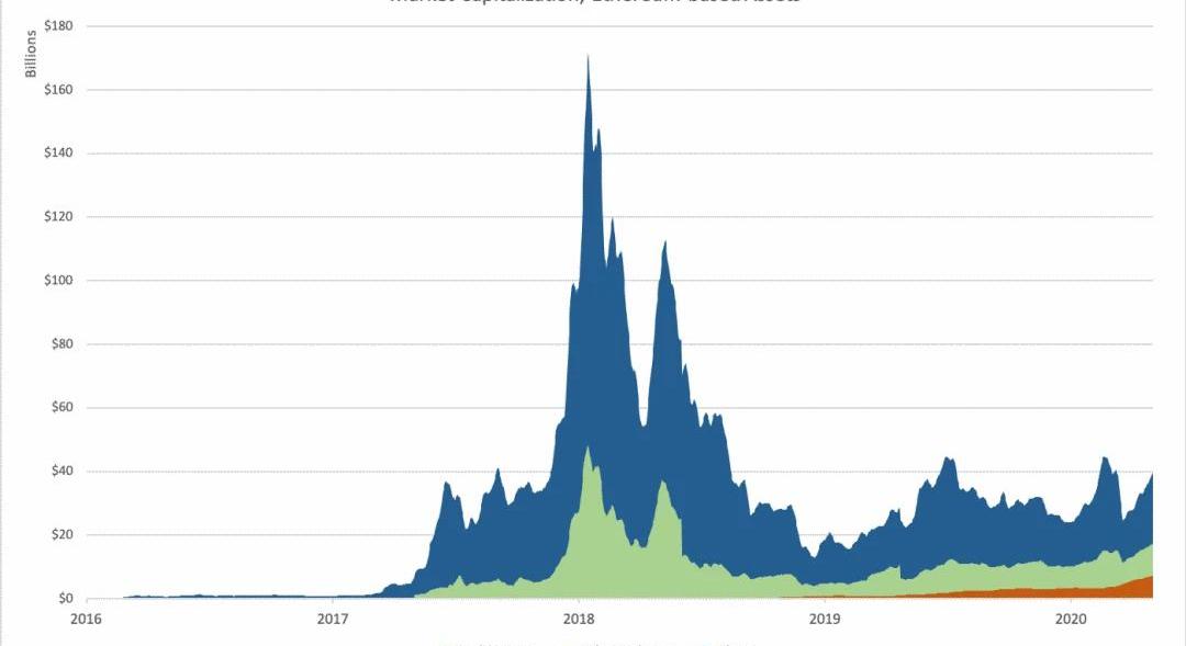 在本文中,我将把分析限定在以太坊区块链,因为以太坊是大约75%的加密美元的流通场所。我们来看看基于以太坊的稳定币的市值。见下图: