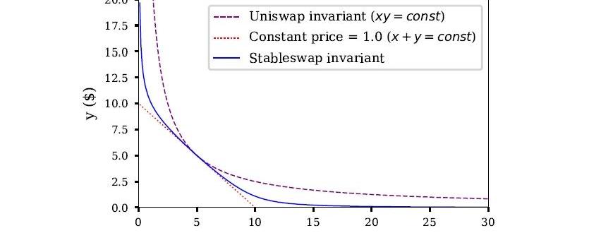 其中,R(i)代表了每种资产的储备量,k是一个常数。尽管这个函数会产生“零滑点”,但是它不能无限提供流动性,因此可能不适合作为独立的去中心化交易所用例实现。实际上,如果作为储备代币的参考价格不等于1,那么所有套利者会不断买入其中一种代币,直至其流动性耗尽。