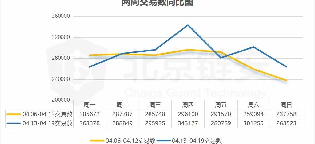 交易数:04.06-04.12:194372904.13-04.19:2036896较之前一周上涨:4.79%详细数据图如下: