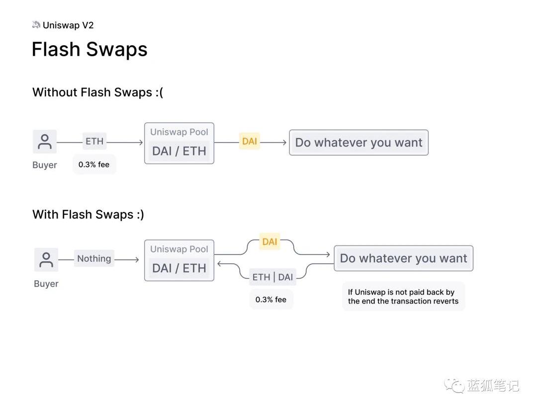 前一段时间,由于bZx事件,闪贷进入人们的视野。关于闪贷,可以参考蓝狐笔记之前的文章《闪贷:为什么闪贷攻击会是新常态?》《加密闪贷:互联网货币的神奇新发明》。而今天提到的Uniswap的闪兑,虽然跟闪贷不同,不过,也可以闻到类似的味道。UniswapV2的闪兑允许用户在Uniswap上提取自己想要的任何ERC20代币,关键是没有前期成本。用户拿到这些代币之后,可以进行任意操作,对其执行任何代码,只有一个前提,就是在交易执行结束时,必须将代币归还。如果不能归还,所有代币都会被撤回。在这个过程中,需要收取0.3%的费用。闪兑为什么有需求?闪兑的需求主要来自于无前置成本的套利场景。由于加密市场的交易场所分散,不同交易场所存在套利空间。如果没有足够前期资金,很多套利都无法实现,很多用户只能望洋兴叹。而对于希望套利的用户来说,闪兑的价值在于,它可以无须前期资金要求,同时可以省去各种不必要的交易步骤,更高效地完成套利活动。Uniswap的创始人HaydenAdams举了两个例子:一是关于DAI套利;二是关于提高交易效率。没有前期资金完成套利。假设用户在Uniswap上可以用200美元兑换出1ETH,然后在Oasis上将1ETH兑换出220DAI,那么用户可以获得20DAI的利润。但是,如果用户钱包没有DAI,这个时候如果想套利应该怎么办?UniswapV2的闪兑可以让用户从Uniswap上提取1ETH,然后在Oasis上卖出220DAI,并用200DAI在Uniswap购买并归还1ETH。在这一过程中,用户钱包中没有一个DAI,但通过Uniswap上预提取ETH,实现了套利。第二个例子是关于提高交易的效率。它可以提高从DeFi项目中进行各种借贷、兑换操作的效率。例如,从用户从Maker上借钱,并将借出来的DAI,再次购买ETH,以提高其杠杆率时,当前的交易步骤比较繁多:1)用户将ETH存入Maker2)从Maker中借出DAI3)在Uniswap上将DAI兑换出ETH为了达到用户想要的杠杠率,用户需要重复上述步骤。这样做的效率很低。如果用户使用闪兑,可以将步骤简化:1)从Uniswap中提取用户想要数量的ETH2)将用户的ETH和从Uniswap中取出的ETH存入Maker3)从Maker中借出想要数量的DAI4)将DAI归还给Uniswap,也就是归还当初提取的ETH这样,一步就可以实现用户所需要的杠杆率,帮助用户通过Maker获得更多的ETH。