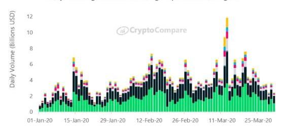 2019年12月以来,来自顶级交易所的交易量持续逐月上升。3月份,许多最大的顶级交易所的交易量平均增加了35%。尽管3月价格暴跌,但这些交易所的成交量水平仍未达到2017年12月牛市运行时的水平。总体而言,所有顶级交易所的交易量在3月份增长了8.0%,达到2880亿美元。