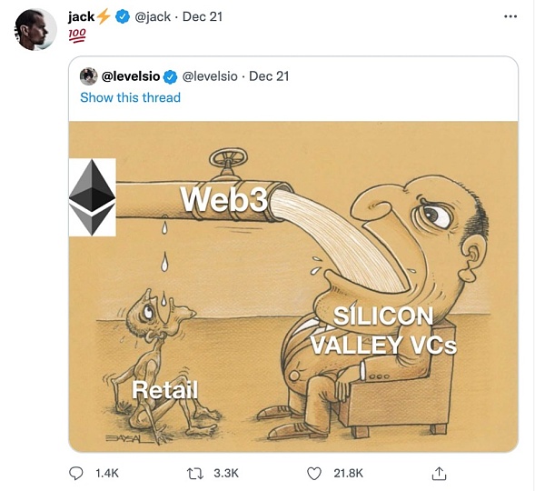 对于这样疯狂炒概念的资本热潮,Twitter创始人Jack Dorsey率先看不下去了。12月20日,Jack Dorsey在Twitter上发文表示,“你并不拥有web3.0,风投们和他们的有限合伙人才是拥有者。Web3.0不会脱离他们设定的激励机制。最终,Web3.0将是一个带有不同标签的中心化实体。你要知道你在做什么……”