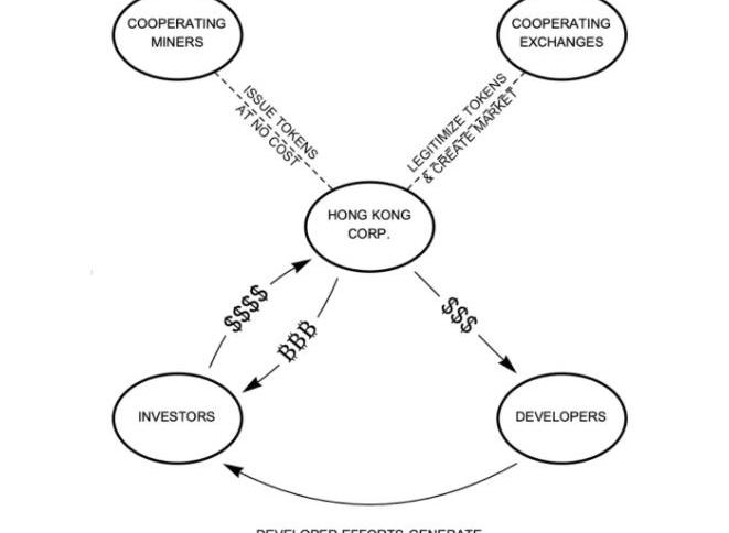 图片来源:JonaldFyookbal发表在read.cash的文章节选1月24日,Bitcoin.com也发文支持,口径和前两位也基本统一。然而,社区核心人员率先发话表示支持,却并不能阻止这之后潮水般的反对声音。为了这场矿工捐赠之争,read.cash的版主还创建了一个专门的“Debate板块”供社区发表意见。1月26日,BitcoinUnlimited(BU)团队的首席科学家PeterRizun就在上面发文,详细解释了在这一方案中资金的运作过程。根据他的文章,这12.5%的区块奖励BCH代币将直接发送到香港的新公司,开发者运营资金就来自这家新公司在交易所出售这些BCH代币所获得的资金。挖矿收益减少后,网络的哈希率将下降大致相同的百分比。由于BCH约占SHA256哈希率的3%,在其他条件不变的情况下,SHA256矿工的总收入将下降~0.4%,下图就形象地表示了这些捐赠代币的流向:实际上,矿商只损失了少部分利润,最终买单的是购买香港公司流出来的BCH代币的那群投资者。在文中,PeterRizun直指这简直就是BCH的开发者服务税,腐败会就此产生。