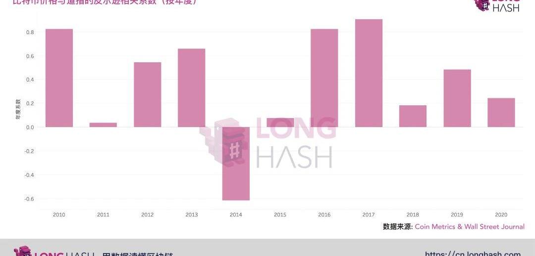 如上图所示,从比特币整个历史来看,其价格与道指的相关性还是很高的。从2010年到2020年3月,两者的皮尔逊相关系数超过了0.84,即强正相关。也就是说,比特币价格和道指的推移步调还是很一致的,你涨我也涨。但是如果按照年份去详细分析这些数据,这种联动模式就不是那么清楚了。就2017年而言,我们得出的相关系数为0.9,但其他年份就没那么高。2012、2013以及2019年都在0.5左右,说明比特币这几年里的走势与传统市场有所不同。而2011、2015以及2018年的相关系数则接近0,说明这段时期比特币与道指之间几乎没有关联性。2014年为中度负相关,也就是说这一年无论道指表现如何,比特币走势都趋于相反。