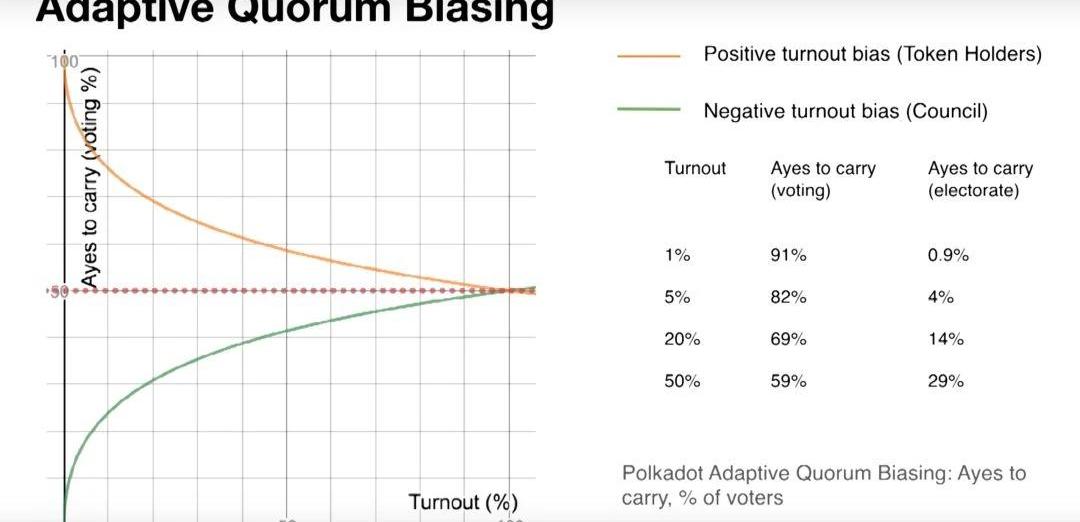 *图片来源自网络自适应法定人数偏差通过基于投票率的投票多数要求,在低投票率情况下提供灵活性,使得如果没有明确多数投票权支持或反对的提案更容易或更难通过。举例而言,一个矿工可能愿意承担更多风险,并在投票支持公投改变他们的底线时自愿锁定DOT最长时间。如果Referenda通过,则矿工的DOT将被锁定,他们将面临一定的经济损失风险。如果Referenda没有通过,矿工的代币就不会被锁定,如果他们觉得不能接受,他们可以出售或退出系统。