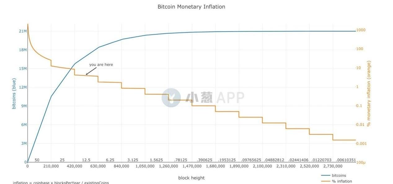 该指标衡量的是按照当下的生产速度,重新生产对应资产当前已经被开采出的流通总量需要多少年。以黄金为例,目前黄金的这一指标数值为62,也就是意味着重新开采当下流通的黄金总量需要62年。而受到比特币诞生之初就预设的定期进行奖励减半的“规则”限制,比特币的S2F指标会在特定的间隔下出现翻倍的增长,以当前水平为例,目前比特币的S2F指标为25,而在今年即将迎来的奖励减半执行后,该指标将直接上升至50,即来到了一个与黄金差异相对更小的水平。