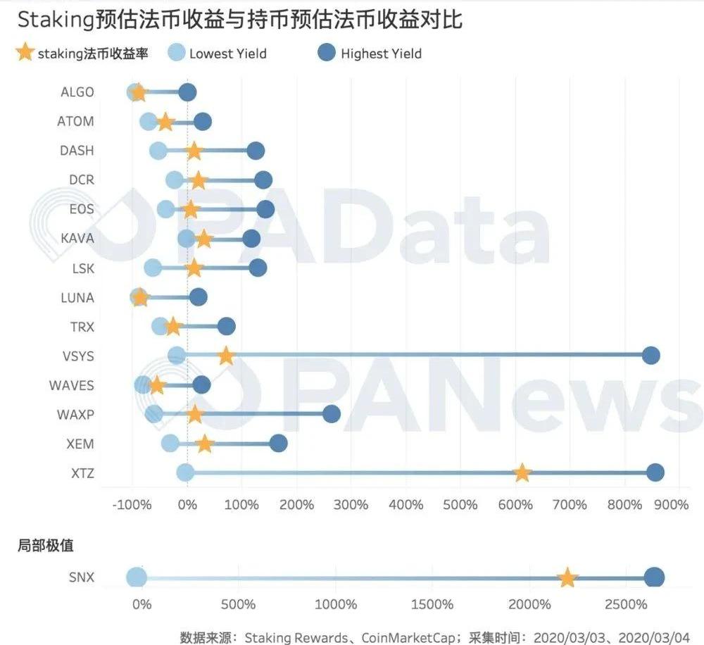 虽然大多数资产都与最高持币收益都相距70%以上,但除了ALGO和LUNA的Staking收益只比最低持币收益高了不到7%以外,其余11种资产的Staking收益都要比最低收益高25%以上。这意味着,从整体而言,Staking的收益风险水平较持币更稳健。比特币峰会Bitcoin2020召开在即!作为媒体合作方,PANews为读者提供八折购票码:RZR20