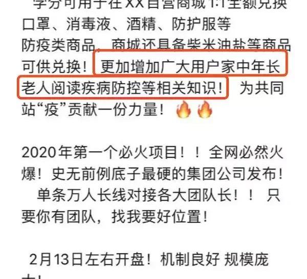 报名参加初阶学习计划,需要10学分,30天后可获得12学分奖励,年化收益240%。而最高级的七阶学习计划,报名需要10000学分,40天后可获得15000学分奖励,年化收益高达456%。和大多数资金盘一样,扬子生物APP的目标,也是中老年人。其话术文件称,可以号召中老年人“阅读疾病防控知识,为战‘疫’贡献力量”。