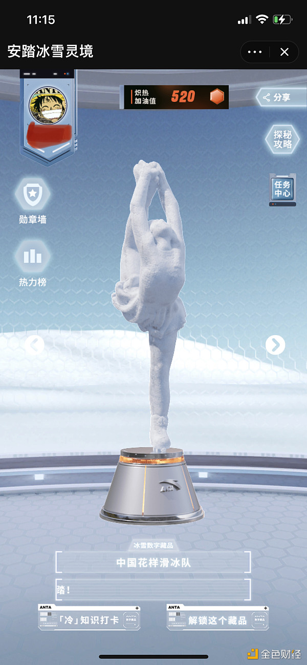 安踏数字藏品在第一阶段共将开启12件,它们是以12个冰雪项目运动姿态为原型的数字冰雪雕塑,每件将发放500份,共6000份。参与者可分别在指定时间内,通过了解回答冬奥相关知识,收集炽热加油值,每满2022点,即可解锁1份数字藏品。