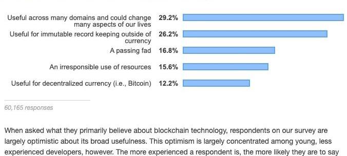 规模:依然小众与其它开源生态相比,区块链开发者生态依然小众。可以看ElectricCapital发布的报告中的一组数据对比:加密货币每月活跃开发者约为7000名,其中最大的生态以太坊为1243名;Apache的项目有贡献者1615名;NodeJS有400多万开发者;Android有600万开发者;全球开发者数量为2600万。报告中统计的开发者数量比较少,只统计了开源项目的写代码的人,如果加上开发团队中其它的角色,比如测试和运维,以及闭源项目,数量会多一些,不过个人感觉这个数量也不超过10万。区块链开发者数量还有很大的增长空间,前方的路依然漫长。开发者所占比例区块链从业者不同角色的比例:工程师:31%客户支持:7%设计:10%市场:13%运营:17%其他:13%销售:9%我们可以看到,工程师占有最多的比例。我所知道的有些团队,工程师占比更高,接近50%-70%。不知道是哪些项目「拉了后腿」。市场供需情况:有需求公司:有需求根据2020年1月9号Linkedin发布的统计,Blockchain现在是第一位被需要的技术,紧随其后的是云计算数据分析和人工智能。开发者:「考虑」进入对于非区块链开发者,CSDN2019年报告中的数据显示:27%开发者有应用或准备应用,66%开发者尚处于初步了解阶段,7%开发者完全不了解,但是相比于2017年,这项技术被了解和关注的程度大幅度提高。未来一年有79%的开发者会考虑进入区块链行业。个人感觉79%这个数据有点偏乐观,「考虑」这个词是一个非常模糊的词,考虑过后,可能只有1%的人进来了。不过让人高兴的是,这个数据侧面反映了区块链已经成为一个难以忽视的平台/技术了。另外,从StackOverflow的2019年调查结果来看,大多数的开发者对区块链保持乐观的态度,并认为区块链是有用的,这些人大多数是年轻的开发者。