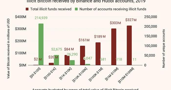 币安和火币在交易所领域里的优势非常明显,但这种优势反而给他们带来了负面影响,因为这两家交易所里的非法比特币交易比例也相对较高,而且他们是两家最大的交易所,并且要遵守KYC规定,所以这可能令人感到意外。他们如何从犯罪人员那里获得如此多的比特币?首先,让我们来针对两个交易所持有非法资金的特定帐户进行分析。总体而言,币安和火币有超过30万个人账户在2019年收到了犯罪源的比特币,这些账户背后的人是谁?他们中有哪些重量级交易者吗?下面,我们根据这些交易所在2019年收到的非法比特币额度进行细分归类(请注意,由于我们将非法资金连接到特定地址,所以下面这张图上显示币安和火币获得非法比特币的总价值约为11亿美元,而不是14亿美元。