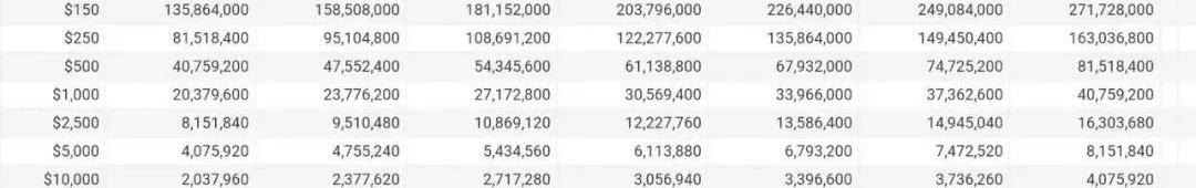 -根据不同的以太币价格和质押率,要达到阿根廷M1供应量的51%需锁定的以太币数量-上述论述仅针对阿根廷而言虽然135.8亿的Dai流通量看似惊人,但是对于未来或将建立的全球免许可型经济体系来说,这只是很小的一部分,毕竟传统资本市场的总价值就高达数百万亿美元。我们再进一步推理下去,假设Dai开始与美元竞争,成为一种全球贸易货币形式。已知美元的M1货币供应量达到了40340亿,假设Dai在其中占到了10%,则其流通量达到了4034亿。假设质押率为250%左右,需要多少以太币经济带宽才能铸造出这么多Dai呢?即使是按以太币的历史最高价格1400美元来算,需锁定663.1%的总流动供应量才能为4030亿的Dai流通量提供足够的带宽。我们需要更多经济带宽。假设MakerDAO中锁定了总流动供应量的46.42%,比2016年TheDAO巅峰期高出3.5倍,以太币的价格必须达到2万美元才能为数千亿Dai流通量提供足够的经济带宽。如果仅锁定18.57%的以太币流动供应量,以太币的价格就要达到5万美元。最后,如果按照目前消耗率范围来锁定以太币的话,大约要锁定大约3.7%的总带宽,以太币的价格必须超过25万美元,也就是说,总的免信任型经济带宽要达到27万亿美元。按照今天的160.2亿美元市值,还要涨1665倍才够。