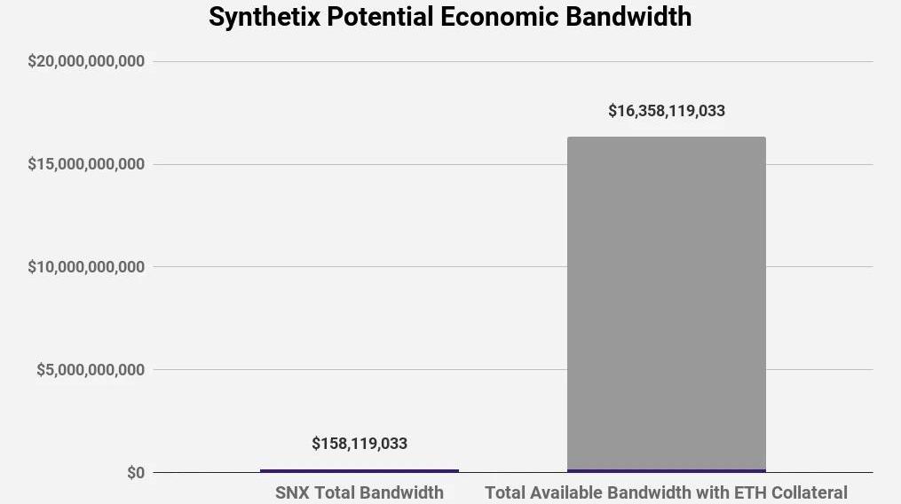 从目前的数值来看,我们可以想象到,Synthetix几乎不可能仅仅依靠其原生代币SNX成功捕获足够多的价值,来为现有的资本市场提供足够的经济带宽。该协议必须增加其他流动质押物类型,从而扩大其经济带宽。由于目前已有超过86%的代币流通量被用来充当合成资产的质押物,该协议正在逐渐达到饱和。几乎没有空间留给其他代币了。因此,该协议只能依靠SNX价格上涨来扩大其潜在经济带宽了。但是,如果将以太币作为一种免信任质押物,该协议的总带宽会扩大100倍以上,从而创建出一系列全新的资产。