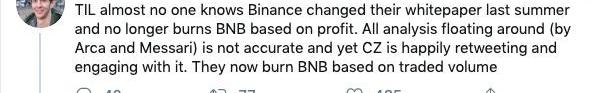 TheBlock研究总监LarryCermak今日于推特指出:“几乎没人知道一件事——币安在去年夏天曾修改了其白皮书,BNB的销毁已不再以季度净利润为基础。所有的市场分析均不准确,但赵长鹏很乐于转发这些分析。实际上,BNB现在季度销毁的依据为币安的交易量数据。”