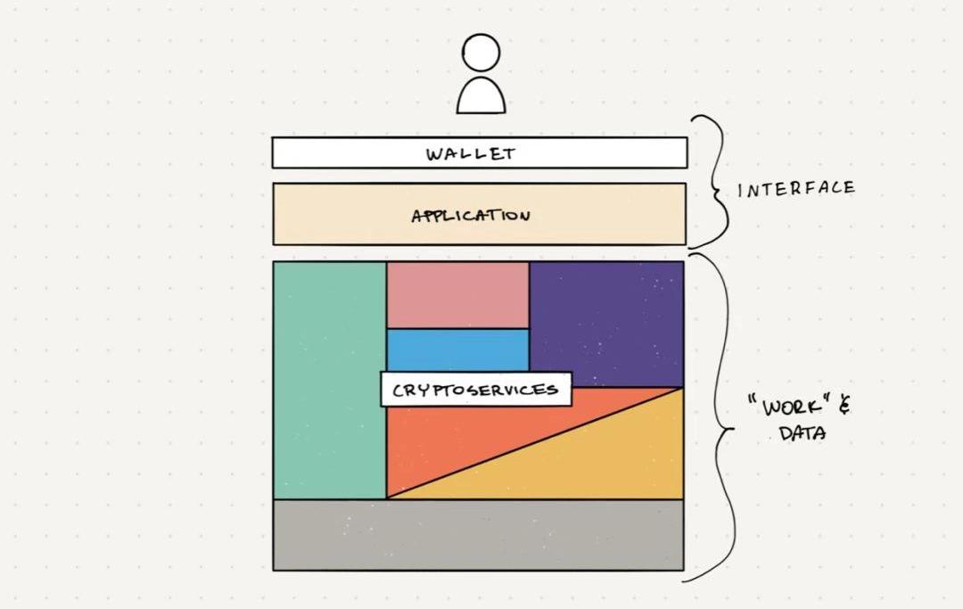 互联网巨擘企业倾向于不断扩大其平台,通过将用户锁定到自家的专有接口中,实现信息的垄断。与之相反,加密网络则倾向于提供单一服务,无法「占有」相应接口,因为他们不控制信息。专业化是有益的,因为一个网络越去中心化,越难以在一个接口中实现一整套服务的局面,不会重现像谷歌、亚马逊、Facebook等巨擘实现垄断的局面。因此,加密网络/Web3中的消费应用都是独立建立在多个「可组合的」协议之上,利用了我们所谓的「加密服务架构」——这很像微服务,但不同的是由主权组件组成。
