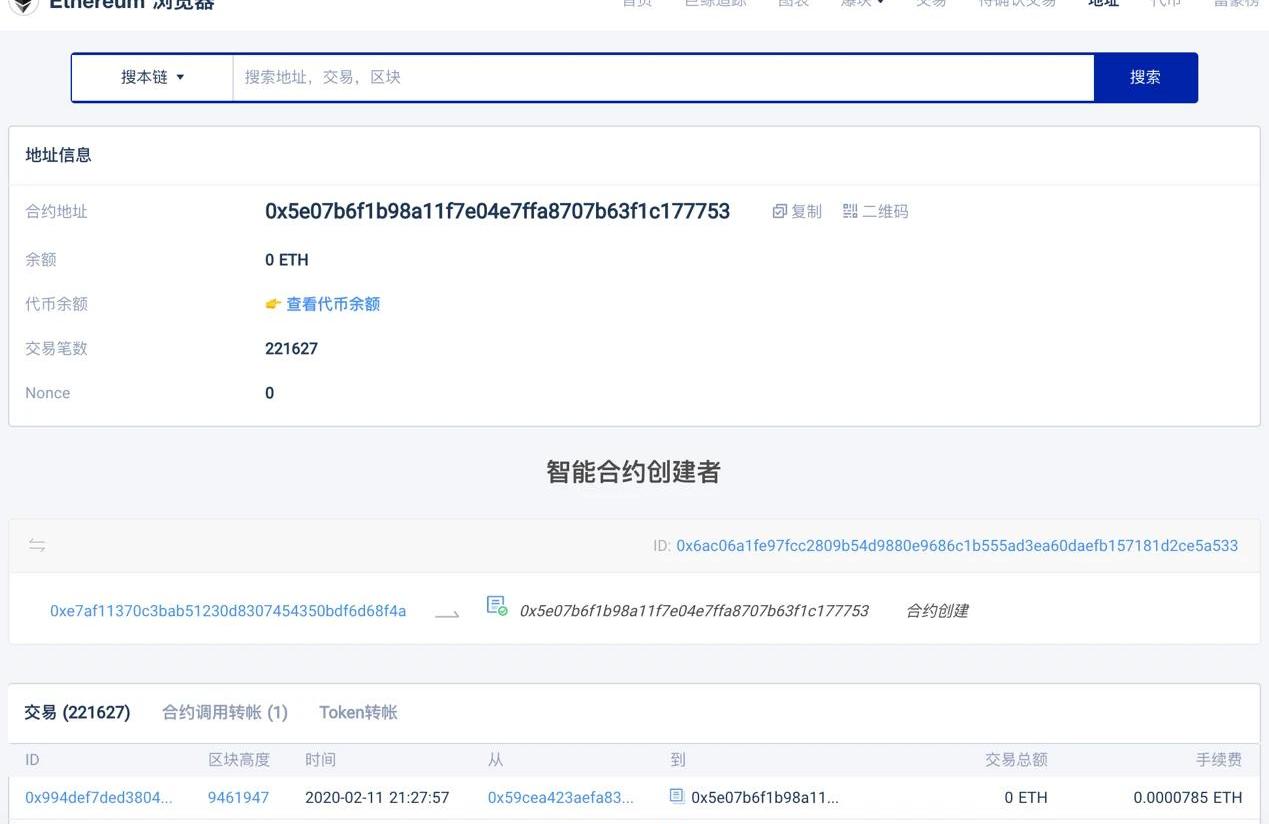 在该地址信息页,我们追溯其交易列表中哈希为0x9e161b19a4b72289614ff73ea3a6976c7b1f2643d868cfe13f4177503616fbd7的交易,通过这是一笔合约调用交易