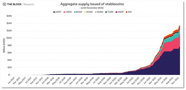 The Block Research在最新的《2022 数字资产展望》报告中指出,稳定币的总供应量已从 2021年初的290亿美元激增至超1400亿美元,年内增长率为388%。