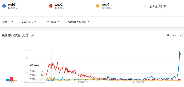 此外,近半年来,随着Web3概念逐渐得到认可,Web3词条在谷歌趋势中的搜索热度也迅速上涨,甚至超过2006年前后Web2大爆发时的搜索热度。