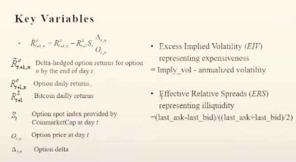 为了更好地做研究,我们必须要定义几个重要的变量,一个是非流动性,非流动性的通用办法就是期权的买卖价差,我们用有效相对价差(Effective Relative Spreads, ERS)来定义,对于期权价格波动程度,我们用额外隐含波动率(Excess Implied Volatility, EIV)来衡量。