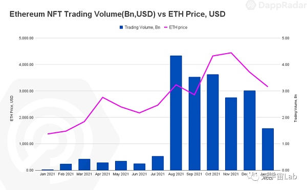 2021 年第三季度,NFT 产生了 107 亿美元的交易。2022 年前十天,第四季度 119 亿美元的季度表现已经强劲。另一方面,自 11 月达到 4,878 美元的历史新高以来,ETH 的价格未能找到支撑,下跌在撰写本文时,几乎 30%。尽管加密货币周期波动,但 NFT 仍保持停滞不前的积极趋势。?