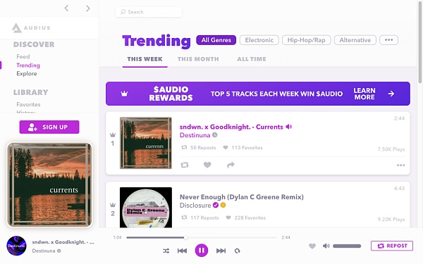 Audius目前有~20万日活,持币地址数~2.5万个,是日活的15%左右,可见平台内大多数的用户是传统互联网用户,仅少数用户是加密圈原住民。
