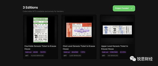 他们发行了三种面额的虚拟球票的NFT,目标筹集1000枚ETH,按照当时市场价约为420万美元。Krause House的NFT在销售开启15分钟内,完成了200枚ETH约84万美元的初始目标。其余的800枚ETH目标筹资额在11月25日完成,共有1700多名支持者参与。