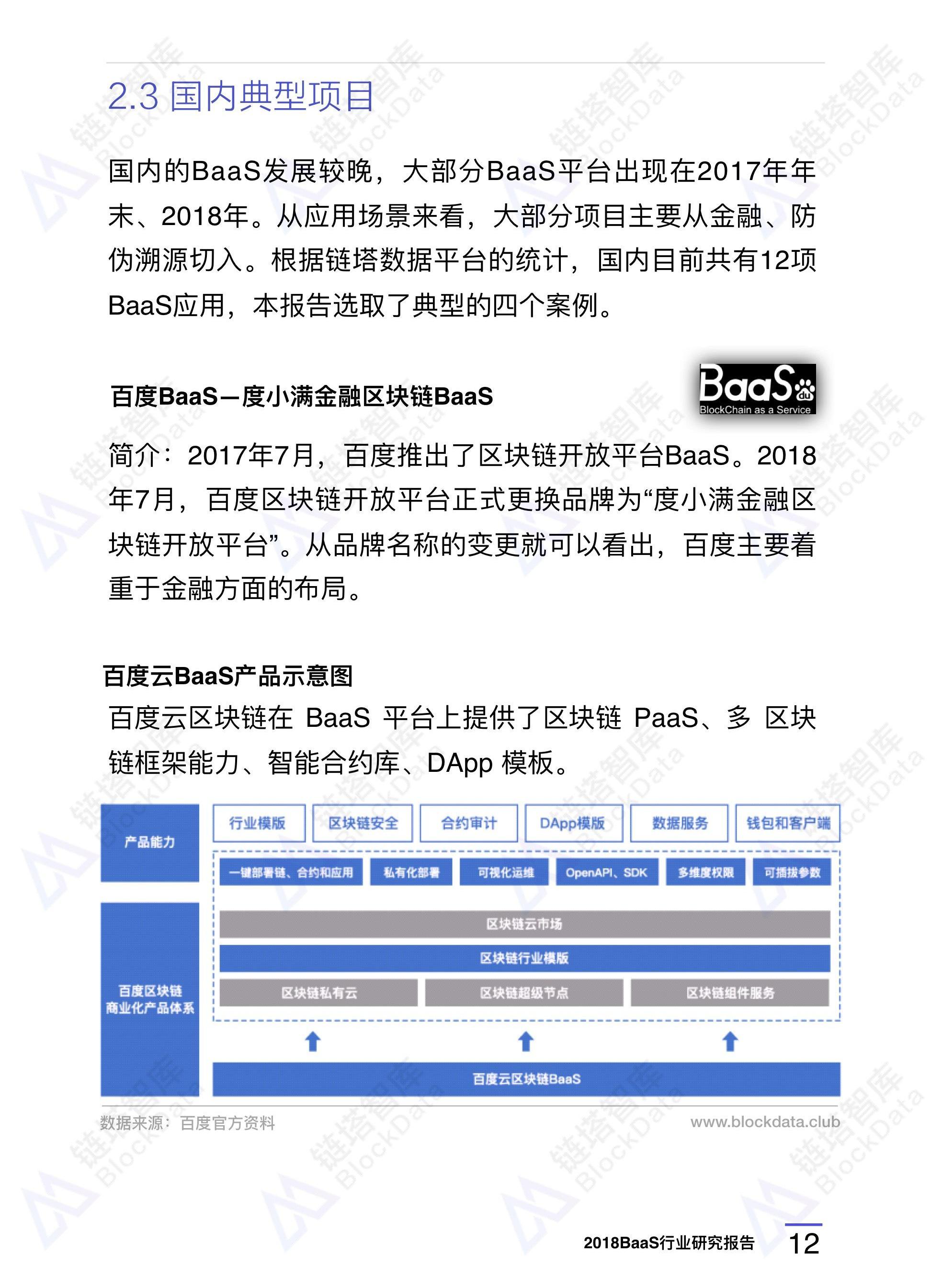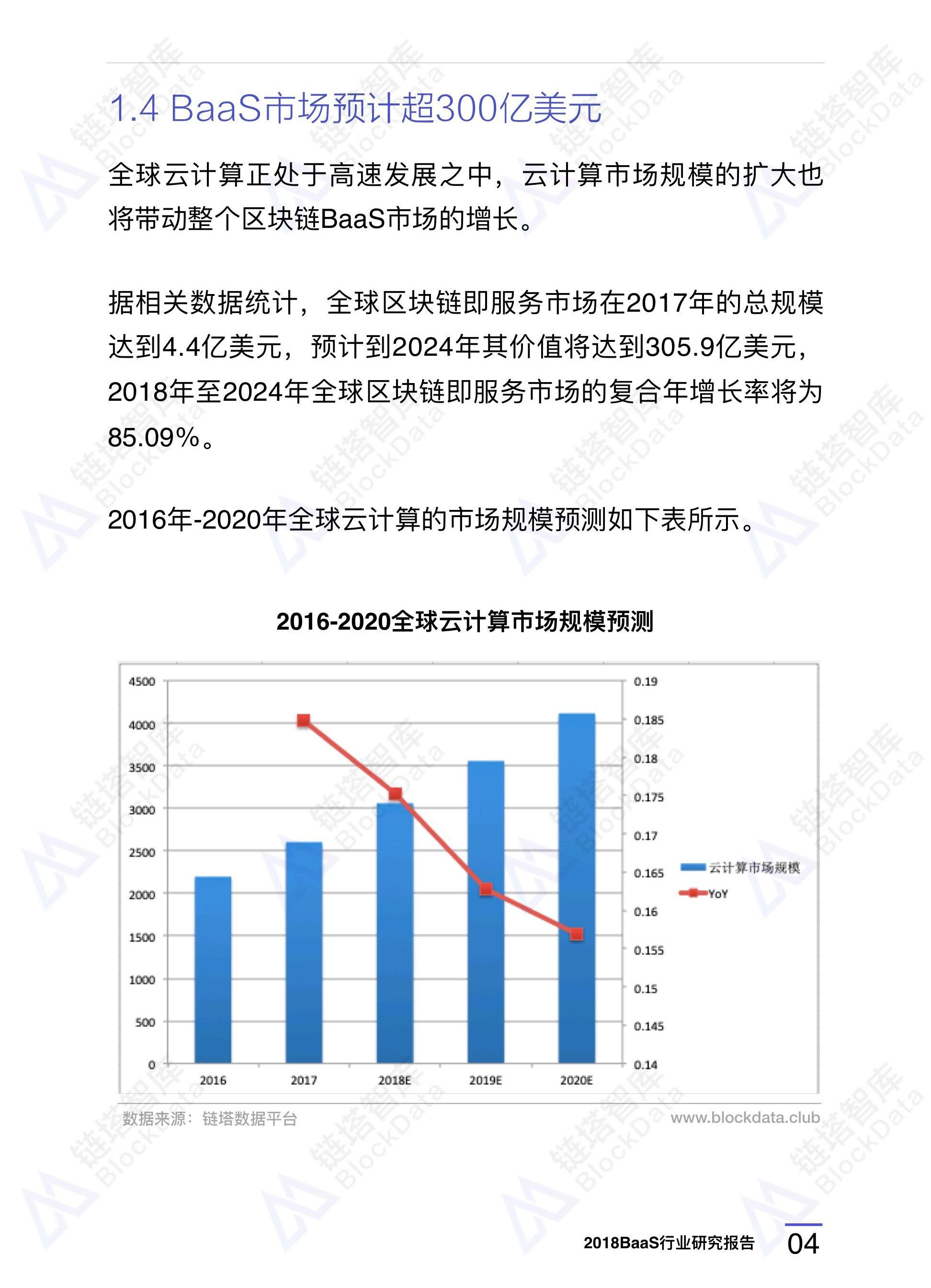 作者:链塔分析师团队来源:链塔智库前言据相关预测,2024年区块链BaaS市场将超300亿美元。2017年至2018年,涌现了大量的BaaS应用,其中不乏谷歌、阿里、腾讯这些巨头的身影。BaaS逐渐成为互联网巨头进入区块链领域的标准姿势,另一方面,区块链垂直领域的公司也以原有优势切入这个领域,BaaS领域逐渐形成互联网巨头和区块链垂直领域并存的竞争格局。链塔Blockdata行研团队针对现有的BaaS应用进行深度研究发现,现有的BaaS应用共有的特点如下:1.切入的场景大多为金融、溯源、供应链。2.大多数都支持HyperledgerFabric系统。3.项目发展处于早期阶段,落地应用较少。4.目前大部分都是ToB模式。链塔Blockdata行研团队认为BaaS行业面临着以下几种发展趋势和挑战。未来的发展趋势:市场前景较为广阔,发展较为迅速;多寡头和垂直领域BaaS并存发展;技术差异较小,产品和服务为特色;BaaS节点离去中心化还有一段距离。BaaS行业面临的挑战:存在较大的监管风险;技术存在难点,性能还需提升;落地存在较大的挑战。