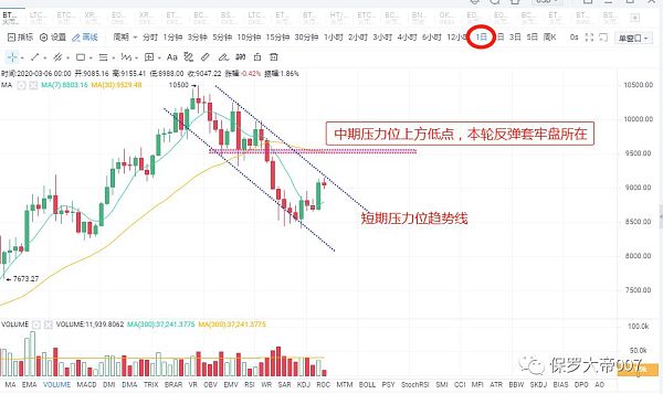 较大周期,周K线看BTC上周大阴线V转。那么大趋势上要走强,需用连阳线将这根大阴线吞噬,现在看还需等待;较小周期,日线看BTC怎样算真正意义转强呢?第一压力是趋势线,短期压力位;第二压力是上方最低点压力,此处是本轮行情套牢盘密集处。中期压力位。